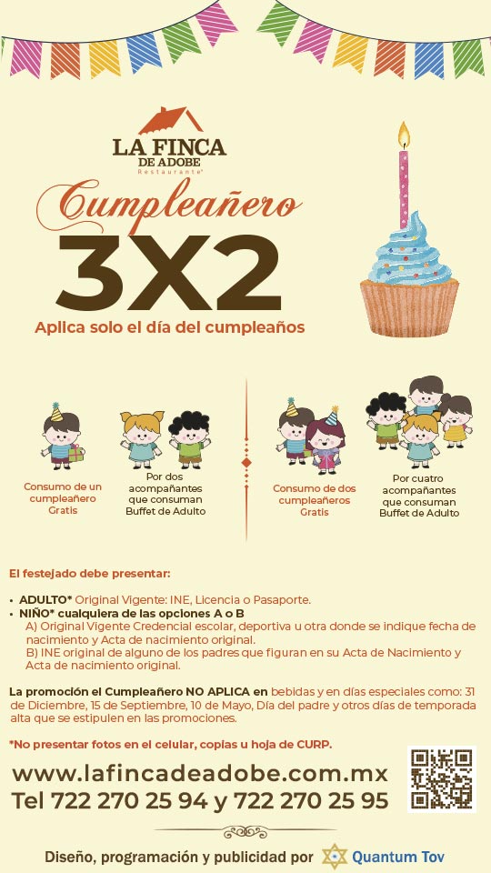 Planifica tus eventos especiales con anticipación. Hacemos reservaciones para eventos empresariales y sociales de lunes a viernes entre las 8 am y las 5 pm, por favor, visíta el restaurante o llama a nuestros números 722 270 25 94 y WhatsApp 722 270 25 95 para realizar tu reservación. Por favor, ten en cuenta que no aceptamos depósitos en cuentas de personas físicas.